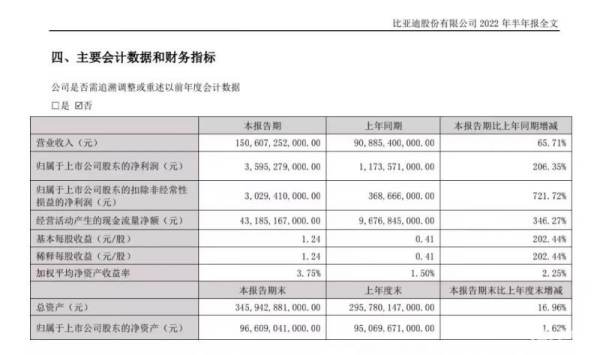 根据比亚迪半年报显示,比亚迪上半年半年实现营收 1506.07 亿元,同比增长 65.71%;归母净利润 35.95 亿,同比增长 206.35%