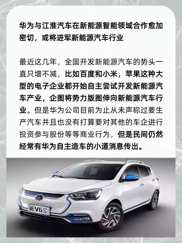 华为与江淮汽车或将进军新能源汽车行业