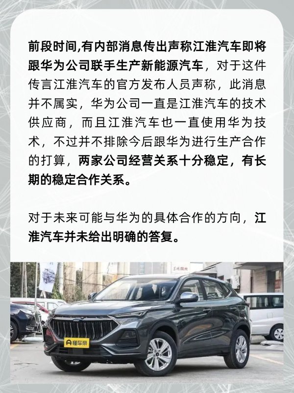 前段时间,有内部消息传出声称江淮汽车即将跟华为公司联手生产新能源汽车,对于这件传言江淮汽车的官方发布人员声称,此消息并不属实,华为公司一直是江淮汽车的技术供应商,而且江淮汽车也一直使用华为技术,不过并不排除今后跟华为进行生产合作的打算,两家公司经营关系十分稳定,有长期的稳定合作关系。