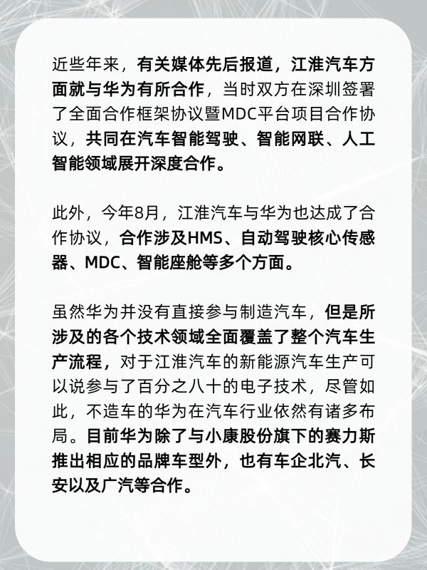 近些年来,有关媒体先后报道,江淮汽车方面就与华为有所合作,当时双方在深圳签署了全面合作框架协议暨MDC平台项目合作协议,共同在汽车智能驾驶、智能网联、人工智能领域展开深度合作。