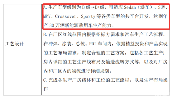 同时,就在这则消息公布的前两天,江汽集团先后发布江淮新港年产30万辆中高端智能新能源乘用车建设项目冲压车间大型同步冲压线招标结果,以及发布对江淮新港年产30万辆中高端智能新能源乘用车建设项目涂装工艺设备的设计、制造、安装、调试、培训及售后服务等招标公告。