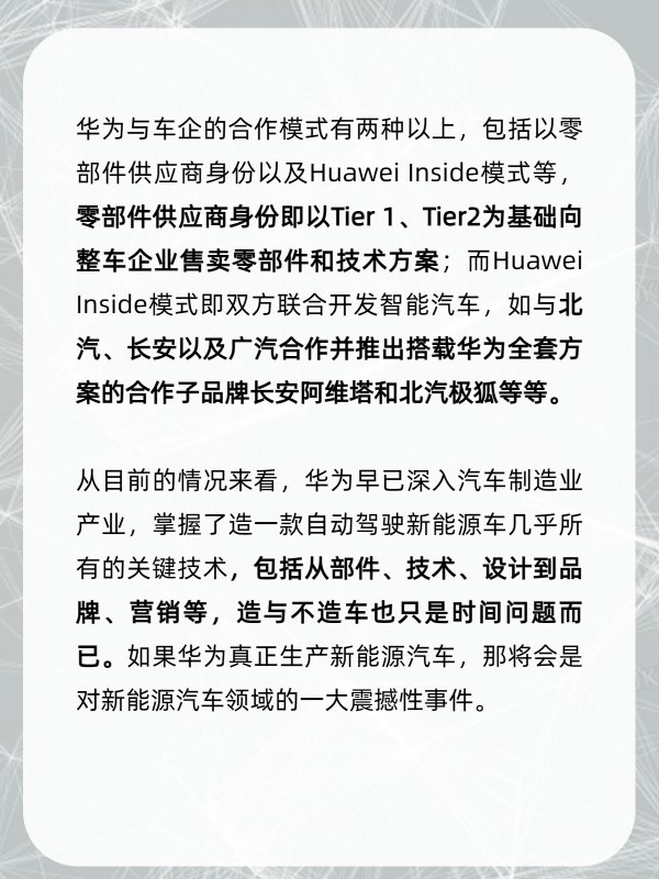 从目前的情况来看,华为早已深入汽车制造业产业,掌握了造一款自动驾驶新能源车几乎所有的关键技术,包括从部件、技术、设计到品牌、营销等,造与不造车也只是时间问题而已。如果华为真正生产新能源汽车,那将会是对新能源汽车领域的一大震撼性事件。