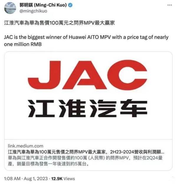 据一位天风证券一位分析师爆料:华为与江淮汽车正在合作开发一款售价达到100万元的问界MPV,预计在2024年Q2实现量产,年销量目标为5万辆。同时,该人士还表示,新车型的营收将由江淮汽车认列,因此新车上市后或将对江淮汽车营收有极大帮助。对此,华为方面对媒体表示不予置评。
