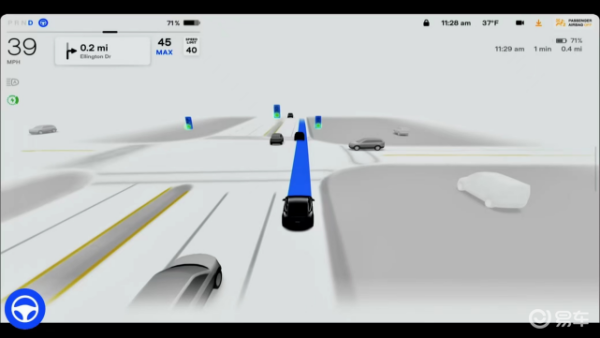 我们也会发现,有不少没有信号灯的路口,路口一般都会有STOP(停)的标志,之前的版本中,特斯拉会在识别到标志之后,进行急刹,这一版改进了在停车标志交叉口时的纵向减速控制机制,使变速过程感觉更直观、更自然。