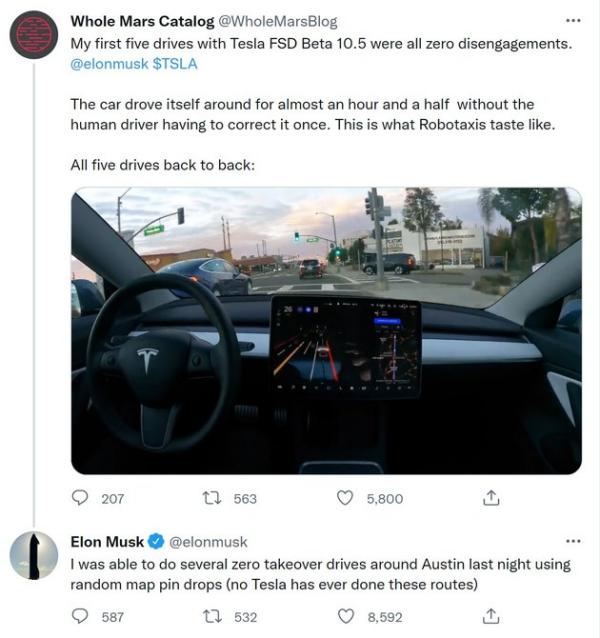 自动驾驶新进展:马斯克亲自测试FSD Beta 10.5