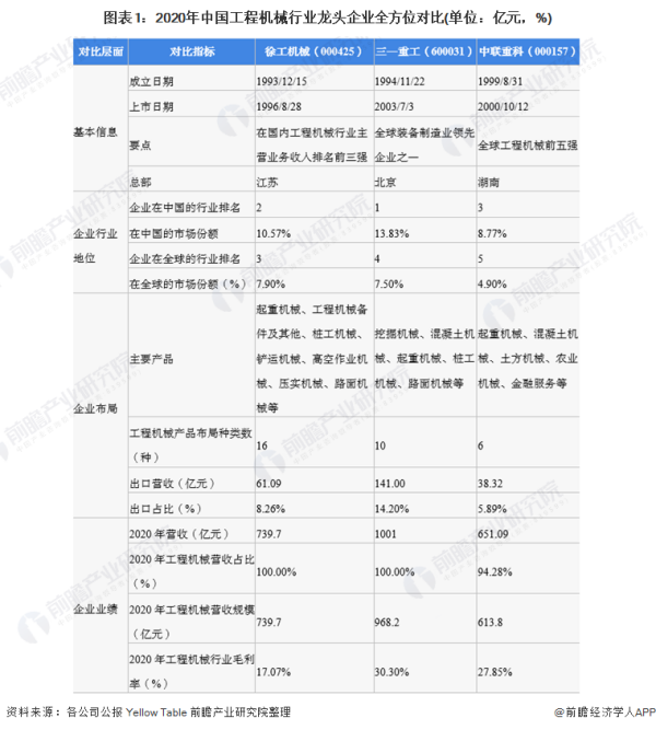 经过多年发展,国内工程机械行业龙头趋势明显,徐工机械、三一重工和中联重科是工程机械行业国内外均知名的龙头企业。2002年,三企业在中国工程机械市场份额占比合计超过33%,在全球工程机械行业市场份额占比合计超过20%,行业竞争优势明显。三一重工在三大龙头中是工程机械行业营收规模最大企业,其在中国工程机械市场排名第一,市场份额占比达到近14%。三企业全方位对比情况如下: