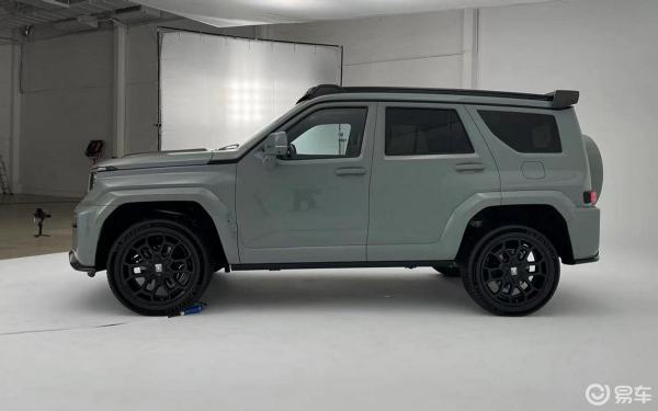 车身侧面看起来是很硬派,很有力量感,车身顶部配备了行李架,三个车窗都相对较小一些,侧面也是采用了传统式门把手,侧面整体是比较平直,在轮拱边缘更是进气外扩,这样看起来要更加的与众不同,新车拥有比较高的离地间隙,越野通过能力是比较强。车身尺寸长宽高分别为5110*2122*1986mm(标准姿态),这样的尺寸就是给人感觉个头是非常的大。