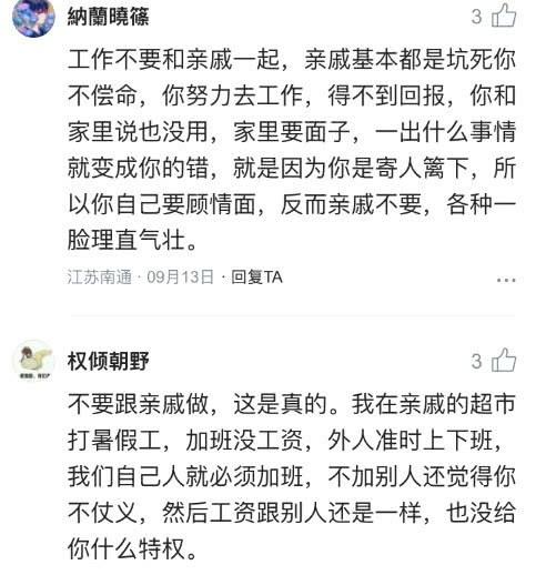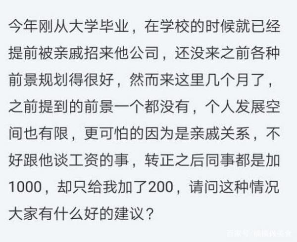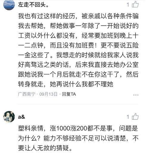 还有些网友觉得:这可能是亲戚给孩子的历练吧,其实在亲戚公司还是有好处的,至少不会受太多委屈,刚出社会没什么经验很容易被坑的。出现这种情况,可以直接找自己亲戚的,正好也可以看清自己的亲戚到底是什么态度,要是不行再走也不迟。