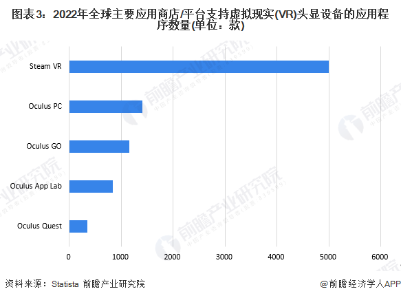 目前,全球主要的支持虚拟现实(VR)技术应用的应用商店或平台有Steam VR、Oculus PC、Oculus GO、Oculus PC、Steam VR等,截至2022年1月份,上述五大平台支持虚拟现实(VR)头戴设备的应用程序超过8000款。