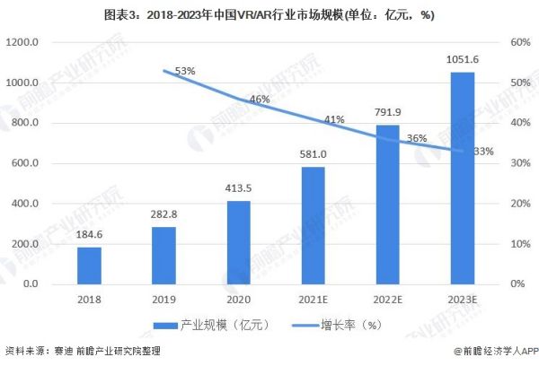 在政策的大力推动下,我国VR/AR行业市场规模近年来保持高速增长。根据赛迪数据显示,2020年我国VR/AR行业市场规模达到413.5亿元,同比增长46%;随着技术日趋成熟,VR/AR在各领域的应用逐步展开,预计2023年我国VR/AR行业市场规模将超过千亿。