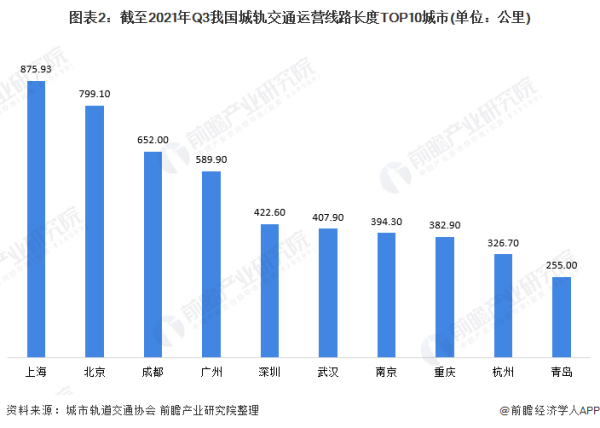 截至2021年9月30日,国内共有4座城市城轨交通运营线路长度超过500公里,分别是上海875.93公里、北京799.10公里、成都652.00公里和广州589.90公里。运营线路长度前10城市线路总长度达6312.76公里,占国内49座城市运营总长度的73.8%。