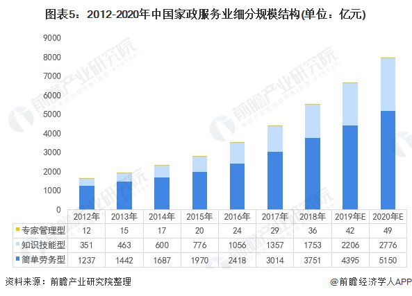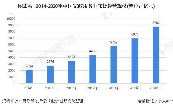 在中国家政行业市场增长方面,2014年中国家政服务行业市场经营规模仅2304亿元,而到2019年家政服务产业规模已达6975亿。家政服务需求旺盛,国家政策持续家政服务行业发展,预计到2020年家政服务行业市场规模突破8782亿元。