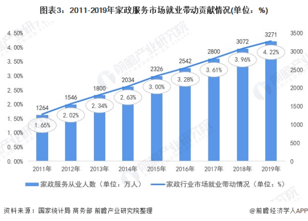 巨大的市场需求带动我国家政服务从业人员不断上升。2019年年中国家政服务人员数量为3271万人,同比增长6.5%。对我国就业贡献逐年上升。截止到2019年底,中国家政服务市场从业人数已经增长至3271万人,对全国就业带动的贡献率高达4.228%,比2011年的贡献率提升了2.57个百分点。可见,家政服务市场的发展给中国的社会就业率带来了很大的助益。