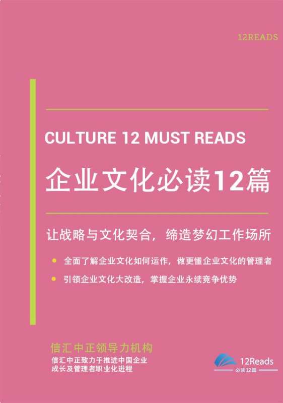 文化很重要。良好的企业文化能推动组织绩效跃进、让员工乐在工作。而不良文化则可能成为企业的沉重负债。《企业文化必读12篇》权威解析企业文化运作方式、如何界定、衡量企业文化及如何发动文化变革等热门管理议题,让文化与战略协调,做更懂企业文化的管理者。