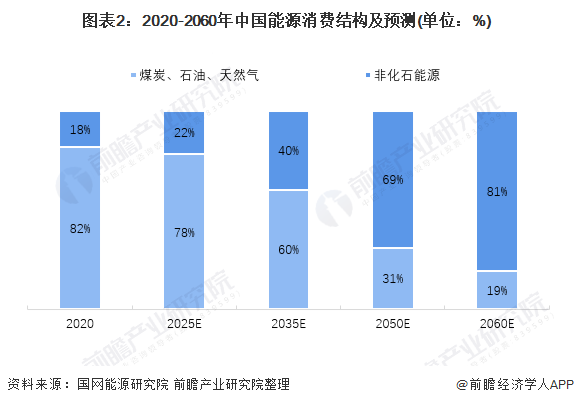 据国网能源研究院预测,至2035年,我国化石能源消费量占比将下降至60%;至2060年,化石能源消费量占比将下降至81%。而以新能源及可再生能源为主的非化石能源消耗比重将从2020年的18%提升至2060年的81.