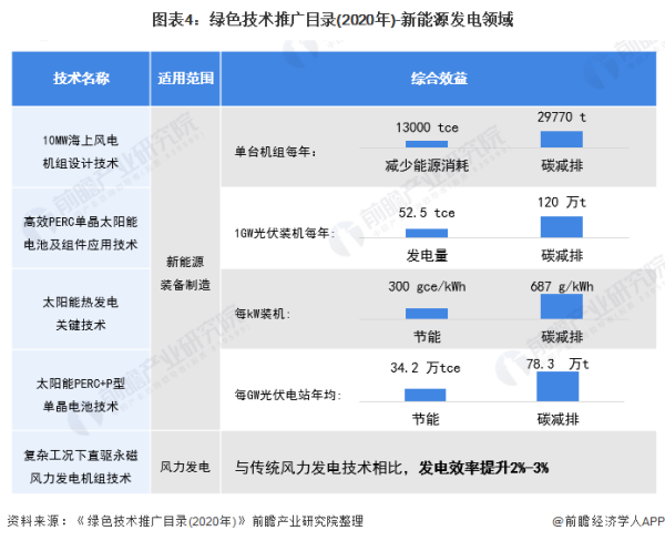 在发展重点方面,根据《绿色技术推广目录(2020年)》及相关规划,风能、太阳能发电技术是新能源发电技术的发展重点,其中,有2项风电技术入选《目录》,有3项太阳能发电技术入选《目录》,每项技术的节能、碳减排效益如下: