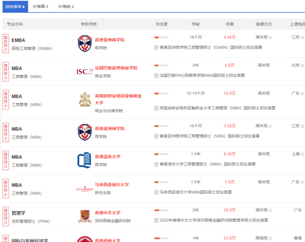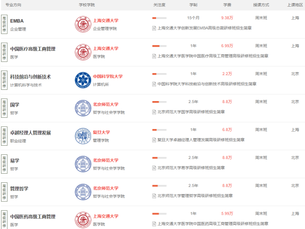 高级研修班的学费跨度比较大,基本在1.8-76.5万元之间。课程的学制也相对来说比较短,基本在1年左右,不超过2年,每年学费在0.9-70万元左右。学费可以根据自身经济能力,选择合适的课程班报名。