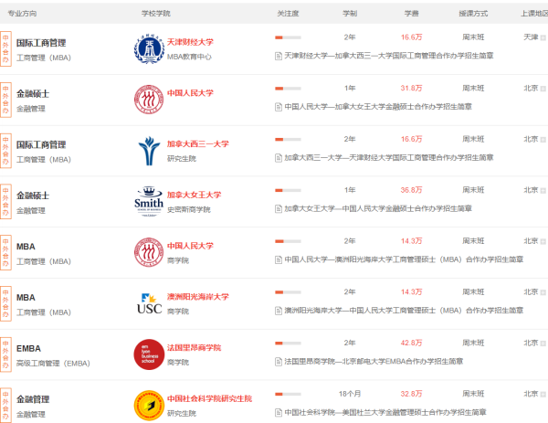 以北京大学为例,北京大学工商管理高级研修班学费、杂费共计人民币39000元,食宿由学校协助统一安排,费用自理。该专业学制一年,每月到北大学习一次,每次上课2至3天。
