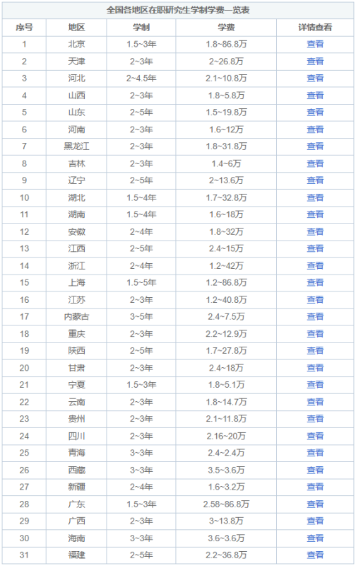 在职研究生主要有有同等学力申硕、非全日制研究生、国际硕士、国际硕士和高级研修班5种报考类型,其不同类型的学费也不同,学制区间是1.5年至5年;学费范围在1.2万至76.5万元之间其中经济越发达的地区,其在职研究生的学费也就越高。具体如下(详情可查看:在职研究生招生简章):