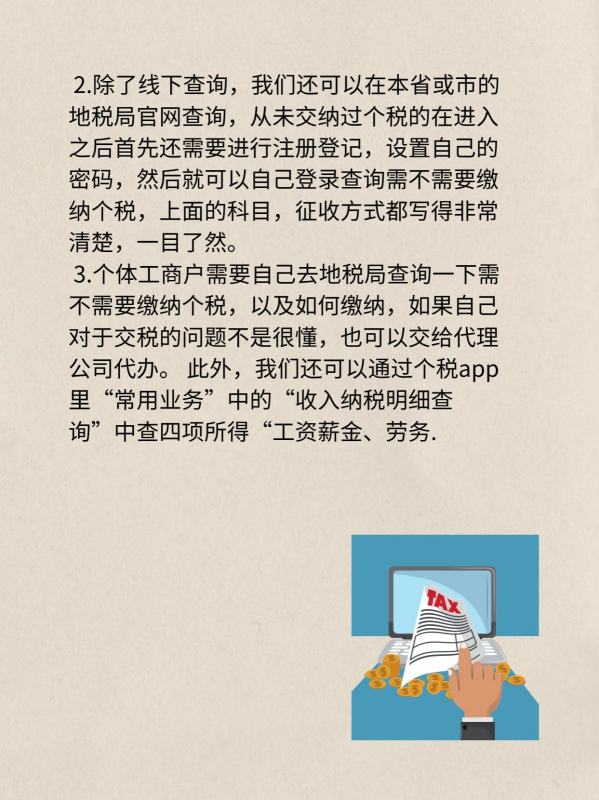 3.个体工商户需要自己去地税局查询一下需不需要缴纳个税,以及如何缴纳,如果自己对于交税的问题不是很懂,也可以交给代理公司代办。 此外,我们还可以通过个税app里“常用业务”中的“收入纳税明细查询”中查四项所得“工资薪金、劳务.