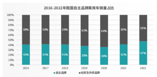 数据说明一切,根据中汽协统计,2022年中国乘用车销量仅有2.1%的小幅增长,而自主阵营与合资、外资阵营之间的力量对比,却有了很大逆转。2022年以前,自主品牌的市占率相较合资、外资品牌而言,基本维持着20%的差距,但在2022年,多次出现单月市占率过半反超的现象,全年差距缩减至6%,行业人士预测,2023年自主品牌市占率将超50%。
