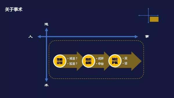 所谓事术,就是我们在事情上怎么去落地。推动公司发展,你要组织出一些节奏化的东西,三个月、一个月,或者几天为一个节奏。