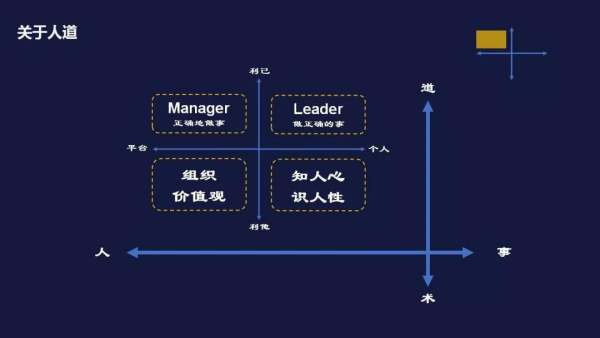 今天,我将把整个过程当中传统的、互联网的、创业的、职业的等各个环节的一些经验综合起来,跟大家做一些分享交流,从上帝视角来看一下公司运营——人事道术合一,即从人道、人术、事道、事术等4个维度的框架,去认知一个企业。