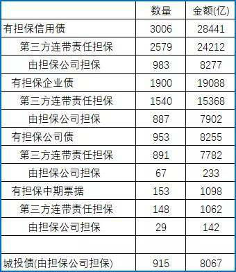 根据choice数据,从全部信用债角度,有担保债券只占全部信用债的约8%,存量余额有三万多亿。其中,由第三方连带责任担保的债券存量约24000亿,由担保公司担保的债券余额占比三成约8200亿,而这部分又有97%以上是城投债,表明担保公司担保债券的种类主要为企业债中的城投债。