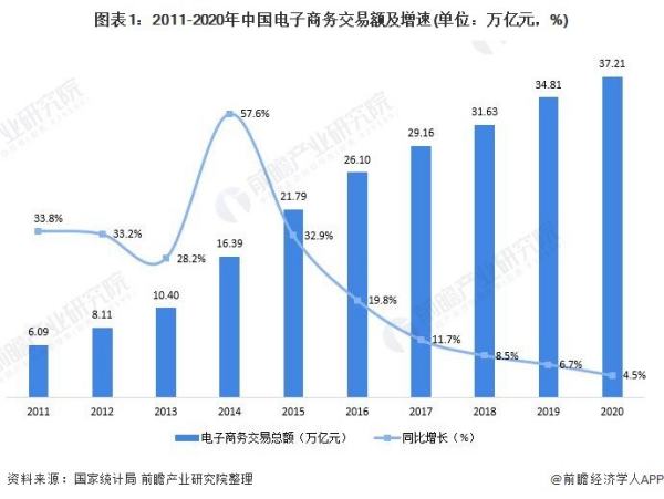 2011-2020年我国电子商务交易额逐年增长,但增速不断下降。2020年,全国电子商务交易额达到37.21万亿元,同比增长4.5%。