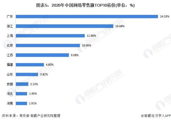 从省份情况看,网络零售额占比排名前十位省份为广东、浙江、上海、北京、江苏、福建、山东、安徽、河北、河南,网络零售额合计占全国比重为87.46%。