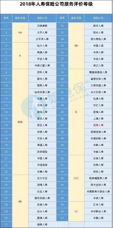 而因为保险作为金融行业的分支,其实最讲究的还是服务,所以主要从服务方面入手,来看保险公司的排名。每年,中国银保信(银保监会的下属单位)都会根据保险公司上一年的服务状况作出评级,给消费者提供服务水平的参考。