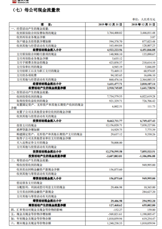 从表格中可以看出,国华人寿的期末现金流近两年都保持着正值。这也意味着即使遭遇突发事件,公司有足够的现金流可以支撑,至少短期内不会遭遇财务危机。从这一点来看,国华人寿的经营状况是比较稳定。