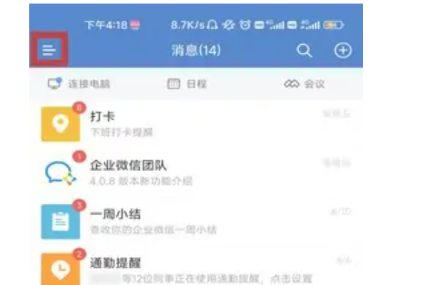 1、打开企业微信,点击左上角的三条横杠。