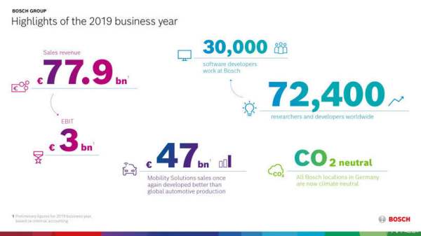 而作为博世的引以为傲的主营业务,汽车事业部销售额达到470亿欧元(约合513亿美元),相比起大陆集团预计2019年440-450亿欧元(约合480-491亿美元),博世汽车事业部业绩继续领跑。但值得注意的一点是,整个2019年博世全球累计减员1.7%,也从侧面反映出车市“寒冬”对于其带来的影响。