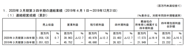 日本电装集团在其2019财年三季度的财报(2019年4月-12月)称,其合并营收总计38,950亿日元(约合354.6亿美元),较上年同期减少2.1%;综合营业利润为1,627亿日元(约合14.8亿美元),同比下跌33.2%。