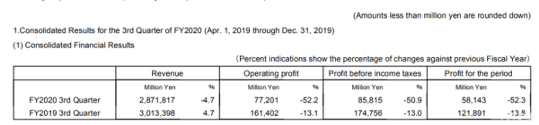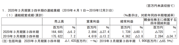 正因如此,据爱信精机2020财年三季度财报(2019年4月-12月)显示,报告期内,其共实现28718亿日元(约合261.4亿美元)营业收入,同比下滑4.7%;营业利润则较去年同期下滑52.2%,至772亿日元(约合7亿美元)。