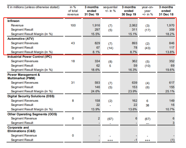 英飞凌方面,据其在2月5日所发布的最新季度财报中显示,2020财年第一季度(2019年10月-12月)收入同比下降2.7%,至19.16亿欧元(约合20.9亿美元),净收入为2.1亿欧元(约合2.3亿美元)。其中,由于全球汽车消费需求的下降,汽车(ATV)收入同比下降2%,至8.3亿欧元(约合9亿美元)。