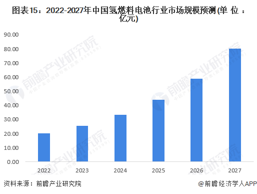 2022-2027年,中国氢燃料电池行业市场规模将会稳步上升,且增速呈现逐年递增的趋势。2022年年初的冬奥会上,亿华通与丰田及北汽福田作为北京2022年冬奥会的赛事交通服务用车的提供商,共计投入使用了1000多辆氢能源汽车,可见氢燃料电池初步应用十分成功。