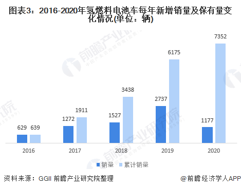 2016-2020年,中国氢燃料电池汽车保有量逐年上升,受到疫情影响,2020年销量有所下滑。截止2020年底,我国氢燃料电池汽车年销量1177辆,保有量7352辆,标志着我国氢燃料电池汽车正在逐渐被市场认可接纳,氢燃料汽车进入商业化初期。