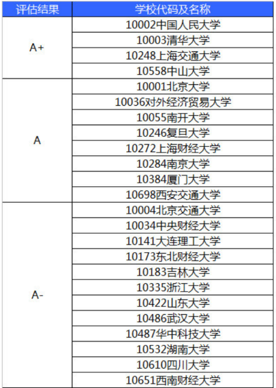 除了以上列举的五所学校还有很多学校不错,比如复旦大学、南开大学、对外经贸大学等,包括我所就读的北京交通大学也不错。可以参考一下下面这张图,列举了学科评估为A的学校。大家可以参考一下。