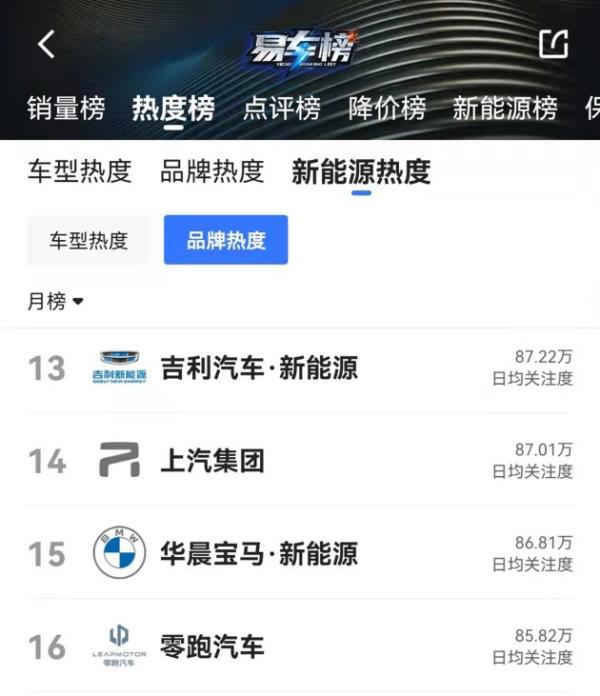 根据易车App新能源热度榜数据,零跑汽车日均关注度85.82万,位列榜单第16名。如需更多数据,请到易车App查看。