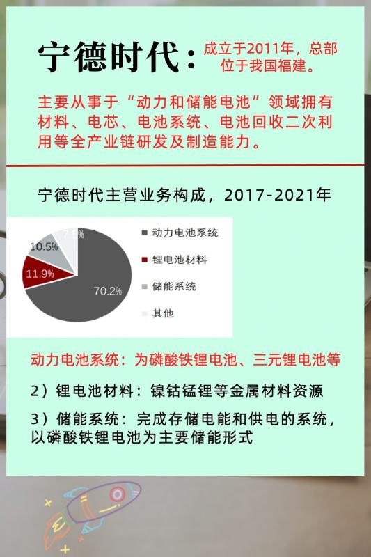 宁德时代:成立于2011年,总部位于我国福建。主要从事于“动力和储能电池”领域拥有材料、电芯、电池系统、电池回收二次利用等全产业链研发及制造能力。宁德时代主营业务构成,2017-2021年,动力电池系统:为磷酸铁锂电池、三元锂电池等。