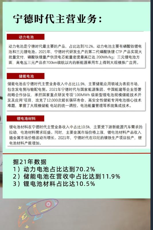 宁德时代主营业务:动力电池,动力电池是宁德时代最主要的产品,占比达到70.2%。动力电池主要有磷酸铁锂电池和三元锂电池。2021年,宁德时代研发生产的第二代磷酸铁锂CTP产品实现大批量交付,磷酸铁锞量产供货电芯能量密度最高已达200Wh/kg;三元锂电池方卤,高电压三元产品在700km续航以内的新能源乘用车上得到大规模推广应用。