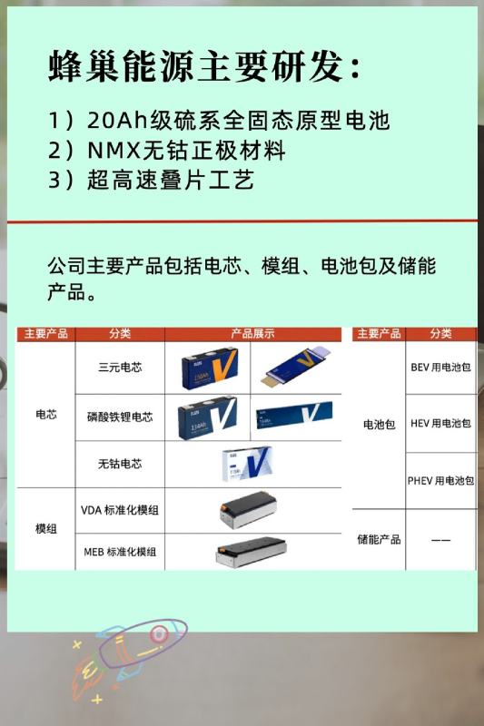 蜂巢能源主要研发:1)20Ah级硫系全固态原型电池。2)NMX无钴正极材料。3)超高速叠片工艺。