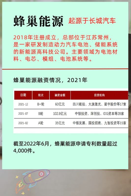 蜂巢能源融资情况,2021年截至2022年6月,蜂巢能源申请专利数量超过4,000件。