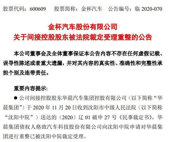 债券违约、评级下调 华晨集团正式破产重整 旗下上市公司火速回应