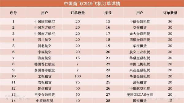 中国东方航空作为国产大飞机C919全球首家启动用户,首批引进5架,东航将成为全球首家运营C919大型客机的航空公司。截止到目前,C919已经取得28家客户共815架订单。