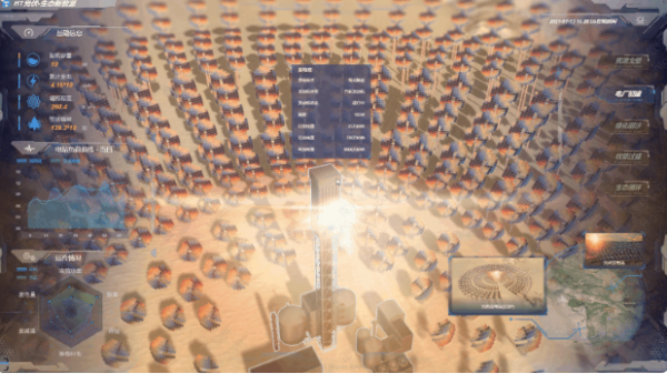 通过现场取景、卫星图等方式,进行场景搭建,人工摆放向日镜模型,向日镜从发电塔向外扩散排布,真实还原装机分布效果,场景从上往下看就像一朵巨大的向日葵,场景中心为发电塔,镜子作为反射太阳光的媒介,发电塔相当于一个大型的热量吸收器,一次性接收成百上千个向日镜同时折射出的热量再经过热能交换,推动汽轮发动机发电。通过图扑引擎的渲染功能,真实还原发电塔吸收热量的效果。