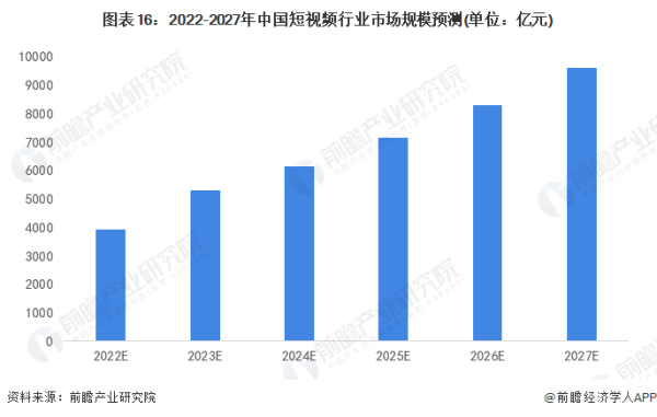 1、发展前景:2027年短视频行业市场规模将接近万亿元