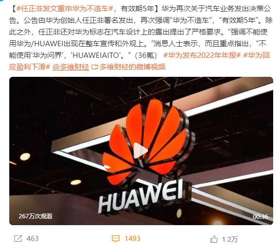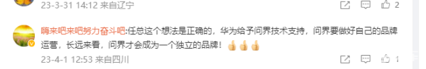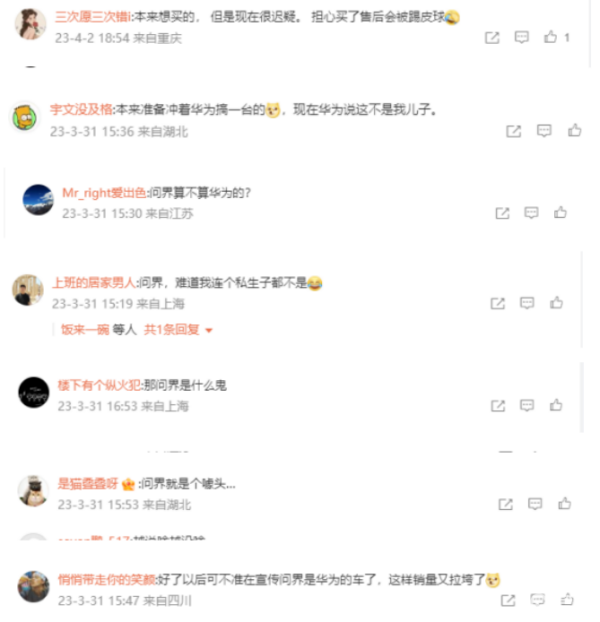 这一系列动作引起轩然大波,有媒体(时代财经)在近期曾做过采访,一位受访用户表示:如果AITO问界不被官方认定为‘华为汽车’,那么就难以支撑这么高的售价,自己也就不会考虑。此外,在【#任正非发文重申华为不造车#,有效期5年】微博下,还有一些网友表示:害怕买车后踢皮球,打消了念头。与此同时,更多网友是开始质疑AITO问界和华为的关系,其中有人预测:销量接下来要拉胯了。